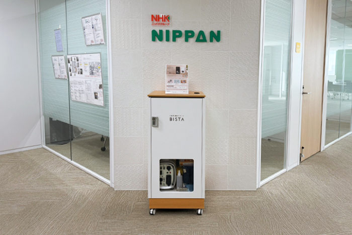 本社の1階エントランス受付横に導入いただきました。BISTAの活用方法や考え方を分かりやすく紹介したPOPスタンドも左側に設置しています。(大阪府)